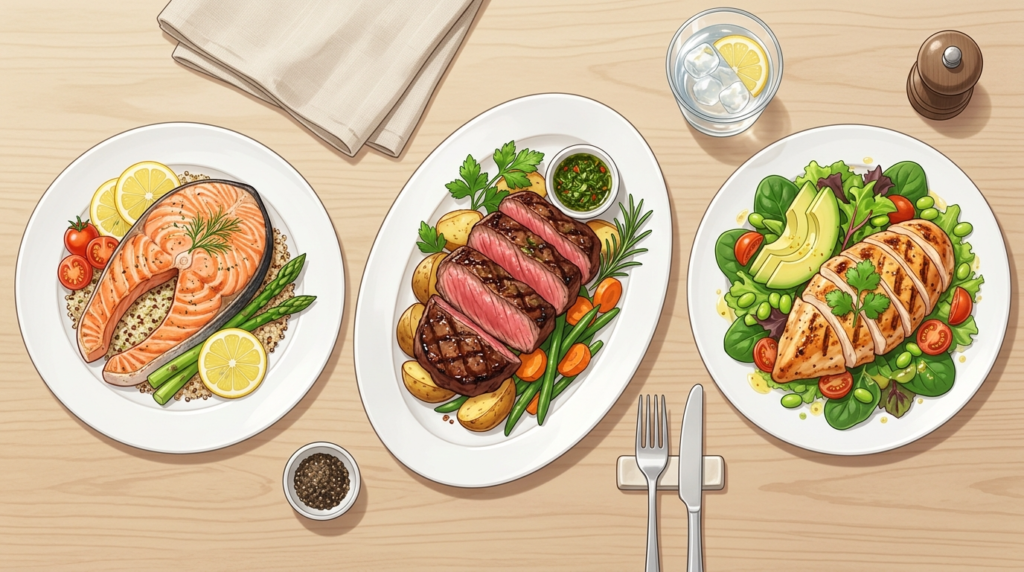 クレアチンは、体内でアミノ酸(アルギニン・グリシン・メチオニン)から自然に合成される物質で、肉や魚にも豊富に含まれています。牛肉100gあたり約0.3〜0.5g、鮭には100gあたり約0.45gほど含まれていると言われます。