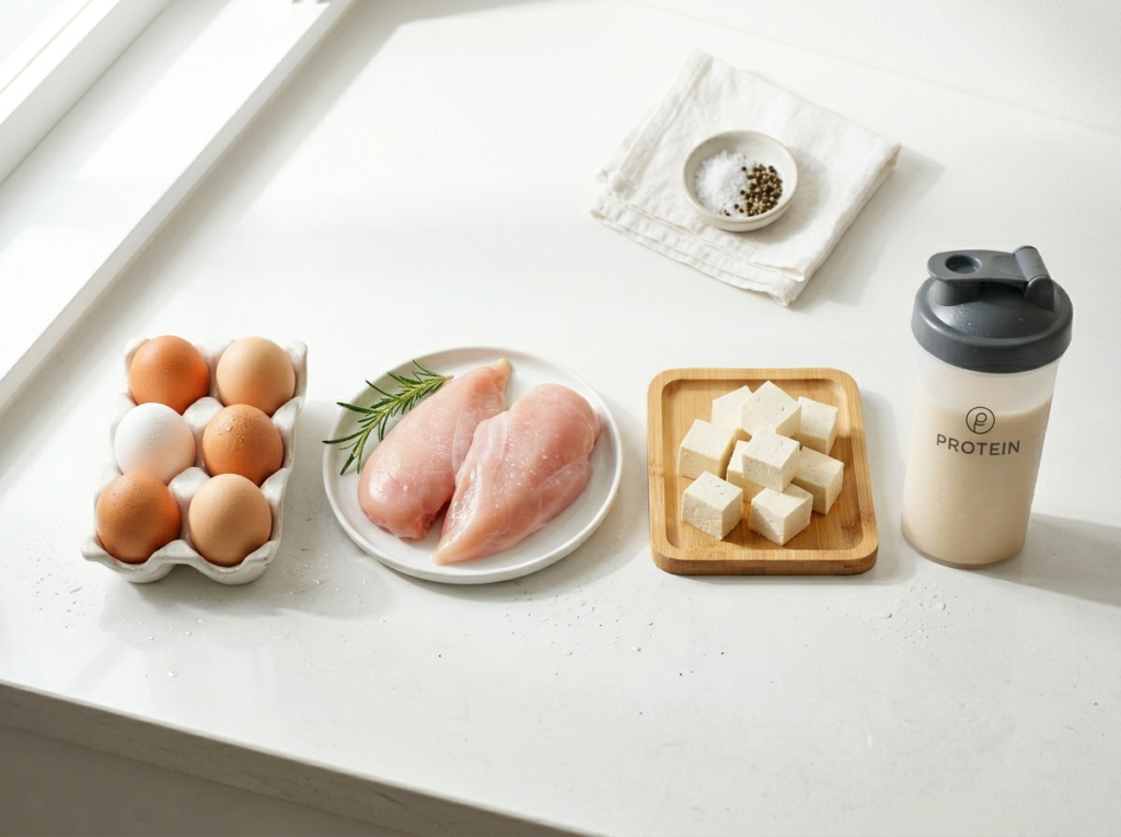 鶏むね肉100gに含まれるタンパク質は約22g、卵1個は約6g、豆腐半丁は約8g程度です。食事だけで毎日100gを安定して摂るには、意識的に組み合わせを考えないと難しいのが現実です。そこでプロテインが便利な補助手段として活躍します。