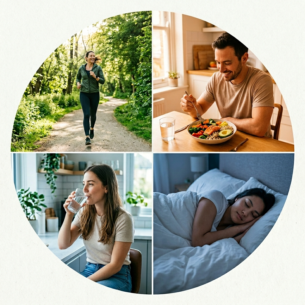 腸の蠕動運動には水分が欠かせません。1日1.5〜2リットルを目安に、水やノンカフェインの飲み物を意識して飲みましょう。プロテインを多く摂る方は特に水分不足になりやすいため、意識的な水分補給が大切です。