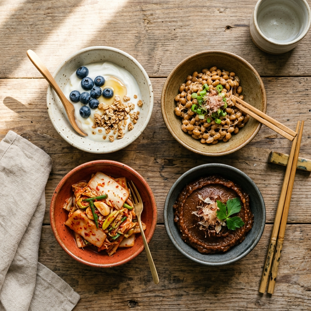 ヨーグルト、みそ汁、納豆、ぬか漬けなど、日本の食卓に馴染みの深い発酵食品は、プロバイオティクスの優れた供給源です。毎回の食事にどれかひとつ加える習慣をつけると、続けやすく効果も出やすいでしょう。